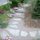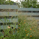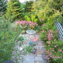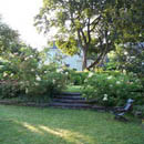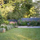 Interesting spaces, color and a complete sense of privacy were the goals in the design of the small Beacon property, all within the context of a very low maintenance planting. The blue fences project out from the blue clapboards of the house, embracing the plantings and unifying the house with the landscape.