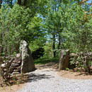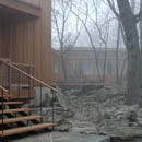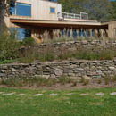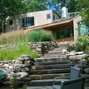 A drainage swale was created just outside the house windows, bringing the ledges right up to the facade of the building. Sensitively built with site-gathered stones, it guides water beautifully around the structure. Trees were preserved as much as possible and also bring the feeling of the woodland as close as possible to the house. A simple walkway/bridge leads one out of the living room, over a dry stream bed, and into the wild.