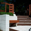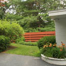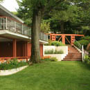 The solution was a playful series of modernistic fences and gates, along with retaining walls and a large gracious staircase leading down to the water from an upper deck off the kitchen. The plantings and fences supported varying needs for privacy screening and transparency; they defined and connected smaller individual spaces around the house, and added interest and intrigue to the experience of this small lakefront plot. At the lower level of the lake the yard was improved with a covered sitting area under the deck which formerly served as surplus storage.